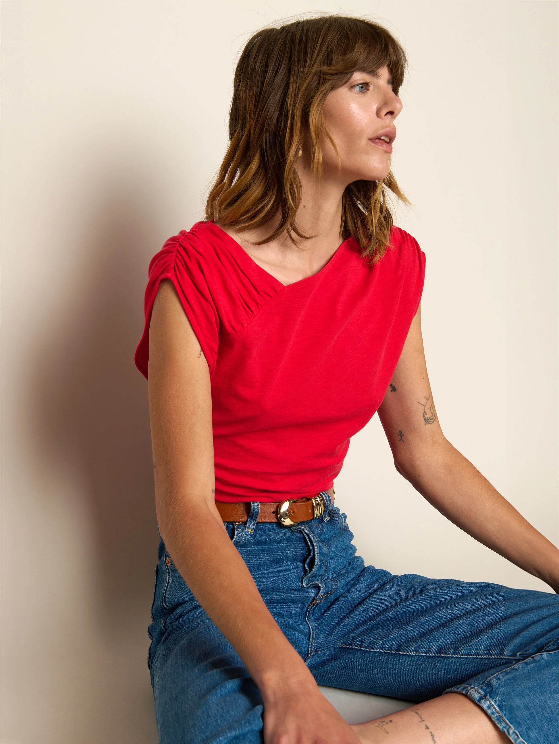 The Aime Asymmetrical Tee offers a modern silhouette with thoughtful detailing—crafted from 100% pima cotton in a fitted, sleeveless cut. Soft shirring adds texture—an unfussed detail that does the styling work for you.