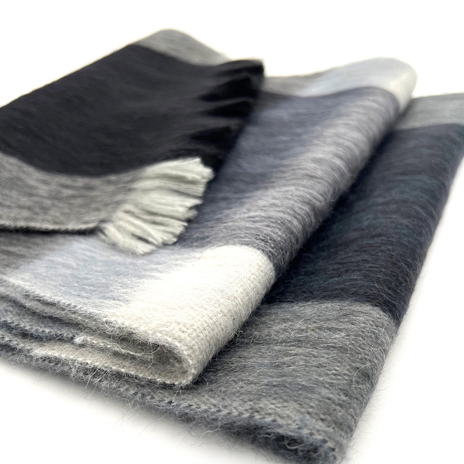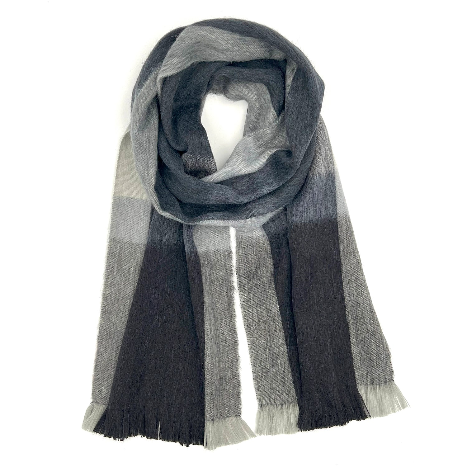 Understated yet powerful, the Steel Brushed Alpaca Scarf features a gradient of graphite, charcoal, and silvery ash tones in a bold plaid design. Woven from an ultra-soft brushed alpaca blend, this piece offers a featherlight hand feel with exceptional warmth. Its modern grayscale palette makes it a versatile unisex option that aligns beautifully with minimal, contemporary wardrobes.