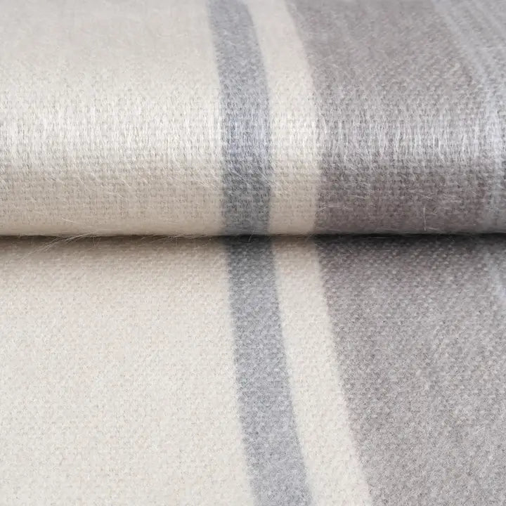 The Silver Birch Alpaca Blanket blends soft ivory, heather grey, and pale blue in a serene striped pattern that speaks to understated luxury. Crafted from a premium alpaca blend, this throw delivers lightweight warmth, exceptional softness, and a clean, elevated aesthetic perfect for modern interiors. A versatile option for upscale home decor retailers, lifestyle boutiques, and design-forward spaces, this throw offers high perceived value and artisan quality with commercial appeal. Ideal for merchandising across multiple collections. Perfect for: Gifting, cozying up by the fire, or adding a pop of rich color to neutral decor.