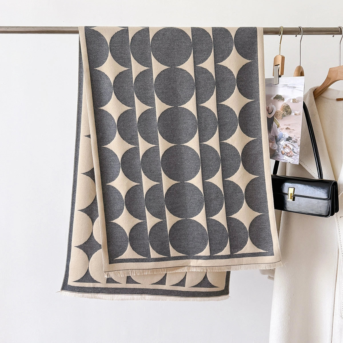 The Amber scarf makes a bold impact with its mod-inspired circular design in charcoal and cream. Clean lines and graphic repetition give it a retro-cool vibe that feels fresh, fun, and fashion-forward.