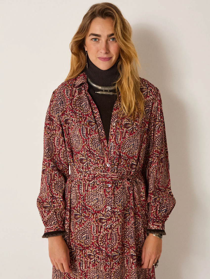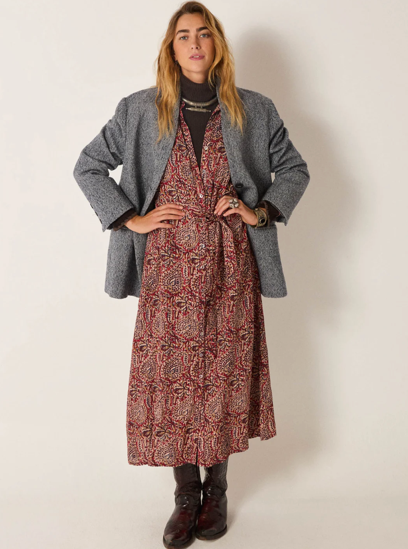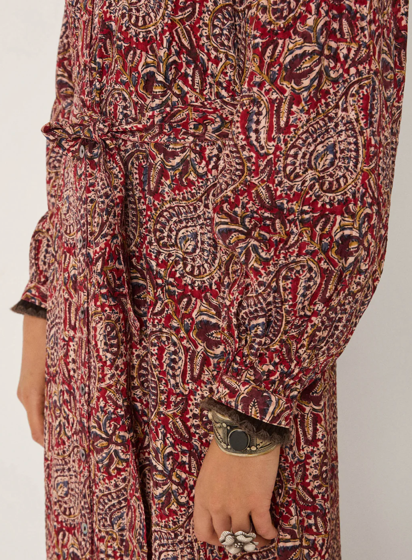 Cut in lightweight viscose, the Aretha Dress carries the Johnny print — intricate paisleys and florals arranged in repeating medallions, mixing red, blue and sand into a surface rich with detail.