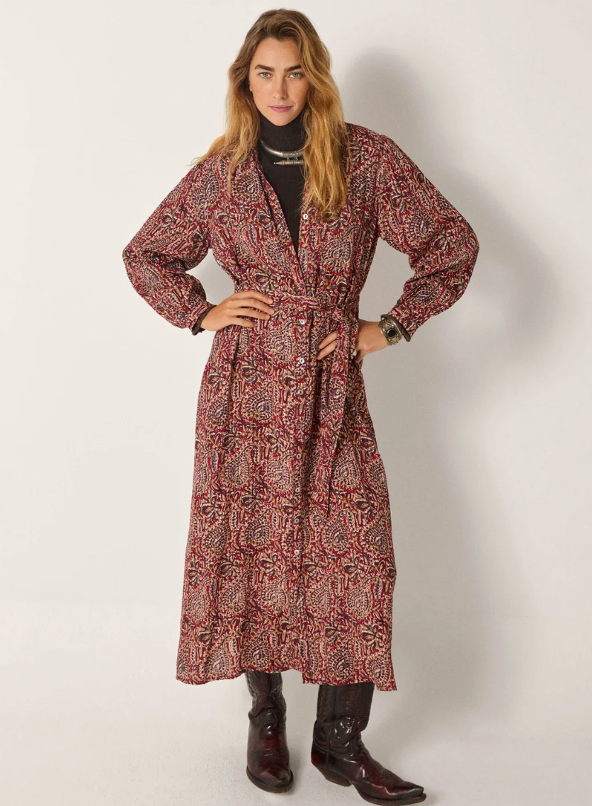 The silhouette is long and fluid, buttoned through the front with a self-belt to define the waist. Full sleeves gather into cuffs, adding balance to the ease of the body. The skirt drops in generous panels, widening towards the hem with natural movement.