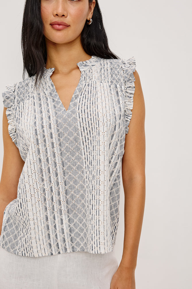 The Arlene Top is crafted from luxe, lightweight linen, with a loose fit, ruffled split band V-neck, sleeveless design, smocked shoulders, and all-over diamond eyelet embroidery.