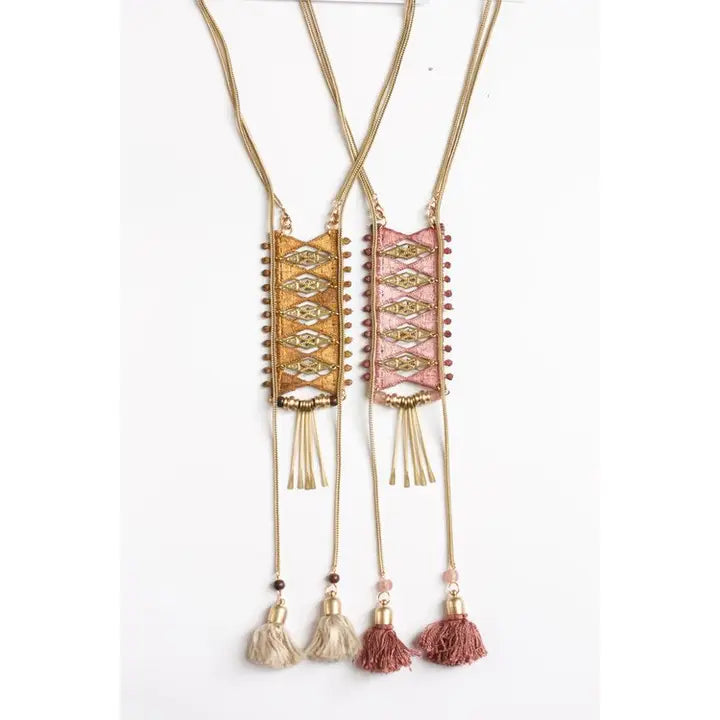 This statement necklace is composed of hand-dyed vintage lace, vintage tassels, glass beads from Bali as well as other pure brass components.