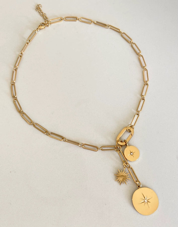 This 14K gold-plated stainless steel paperclip necklace features a cascading effect of stars and round sun-shaped tassels, fastened together by a snap hook. Very chic for a special event or simply chic and casual with more casual clothes.