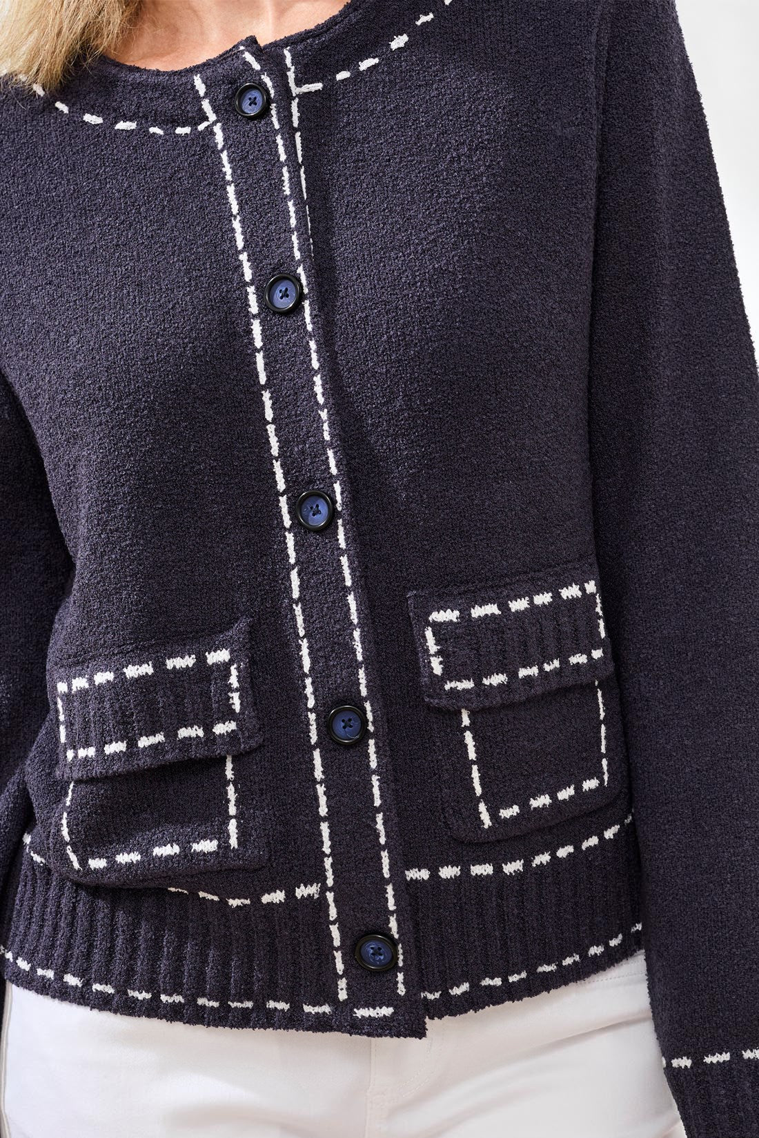 Enjoy the soft texture and easy layering of this boucle yarn cardigan, designed with long sleeves and a round neckline. A button-front closure and contrast stitch detailing add polished charm, while front flap patch pockets provide functional appeal.