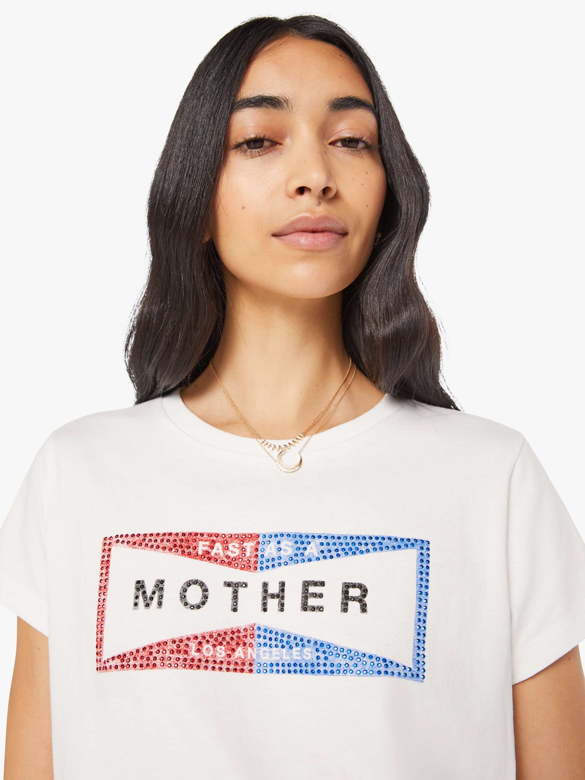 Catch me if you can. A soft crewneck with a slim fit for a vintage look and feel. Made from 100% cotton in white, The Boxy Goodie Goodie in Fast As MOTHER features a faded red and blue graphic embellished with metallic rhinestones and MOTHER across the front.
