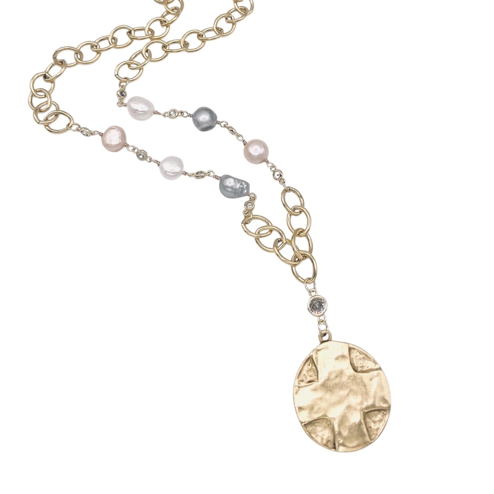 This handcrafted statement necklace blends luminous freshwater pearls in ivory, blush, and silvery grey tones with modern elongated gold links for beautiful contrast and texture. The focal point is a sculptural coin pendant featuring a raised cross on the front and the Lord’s Prayer handcasted on the back — creating a piece that feels both powerful and personal. This pendant was handcasted from an actual vintage religious coin.