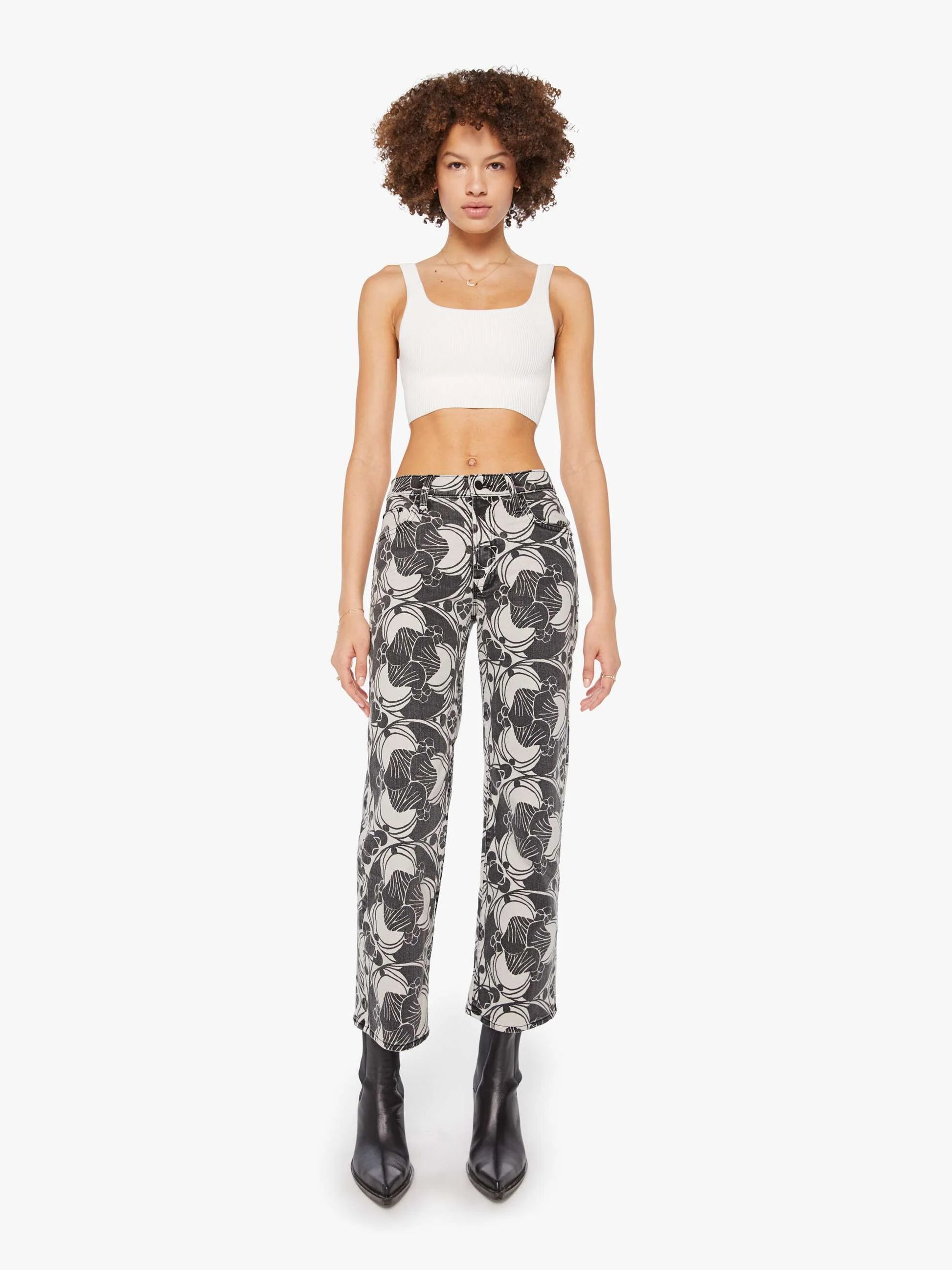 Visual effects. Mid-rise pants with a wide straight leg, zip fly and clean ankle-length inseam. Made from a semi-rigid cotton blend, the pants are designed in a faded black and cream oversized graphic print.