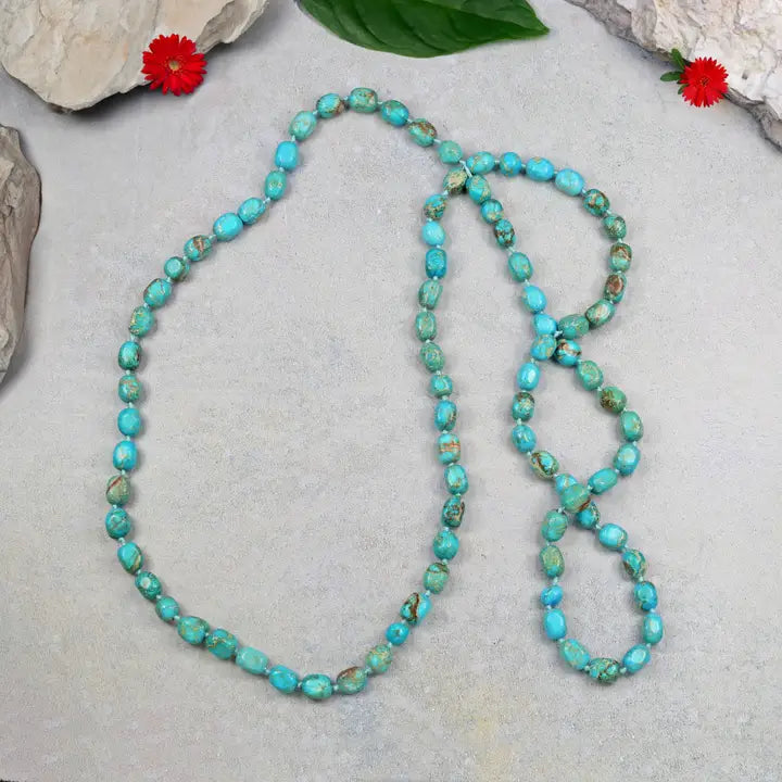 Immerse yourself in natural beauty with the Ocean Earth Infinity Necklace, a 39-inch strand of striking imperial jasper beads in soothing turquoise hues with earthy matrix patterns. Each bead is oval to nugget-shaped, revealing unique variations in color and texture, strung together on vibrant blue thread for a subtle yet artistic contrast.