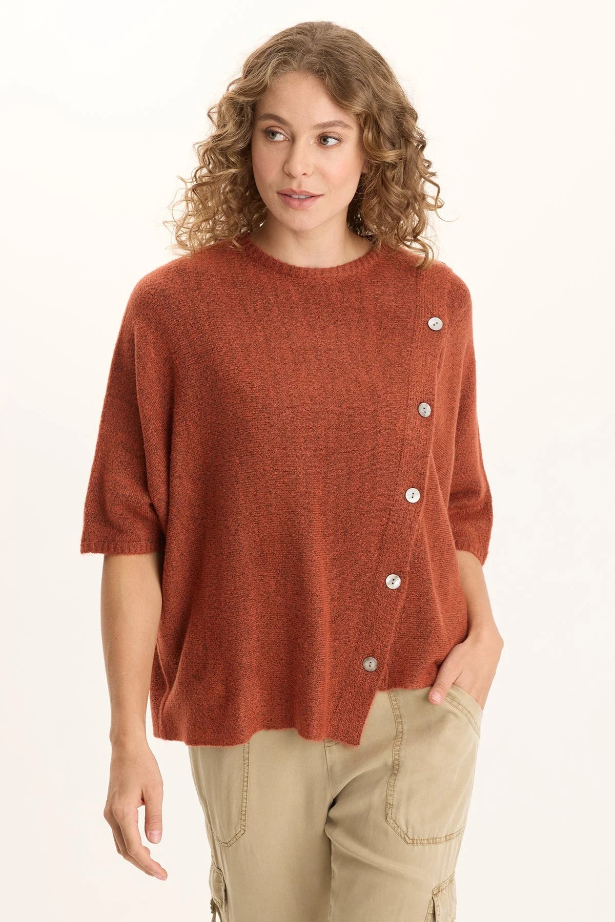 Diagonal buttons create a unique layered look with this poncho worn as a top slightly off the shoulder. Mid-length sleeves and our soft Mirelli Knit make Osiris a go-to for layering.