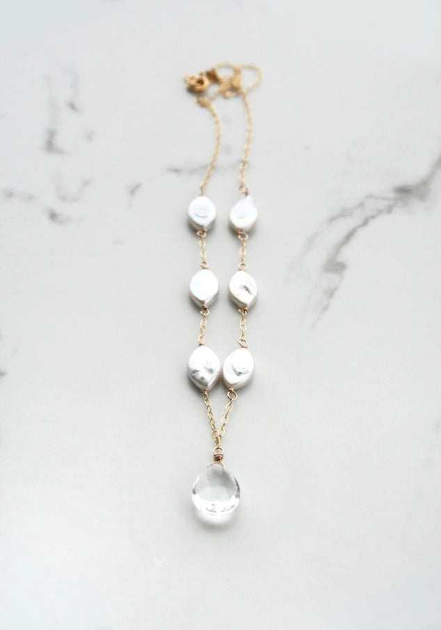 A necklace of oval freshwater pearls and a crystal quartz gemstone are the perfect combination for your wedding jewelry. The necklace is classic and elegant.