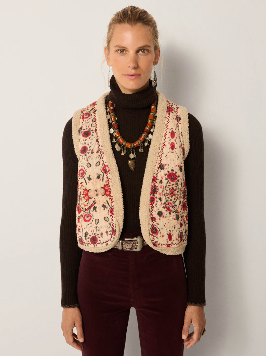 Quilted cotton dobby, patterned with blooming reds and earthy motifs across a pale ground, lined in soft shearling for warmth. The print feels vintage and folkloric, a tapestry softened by time.