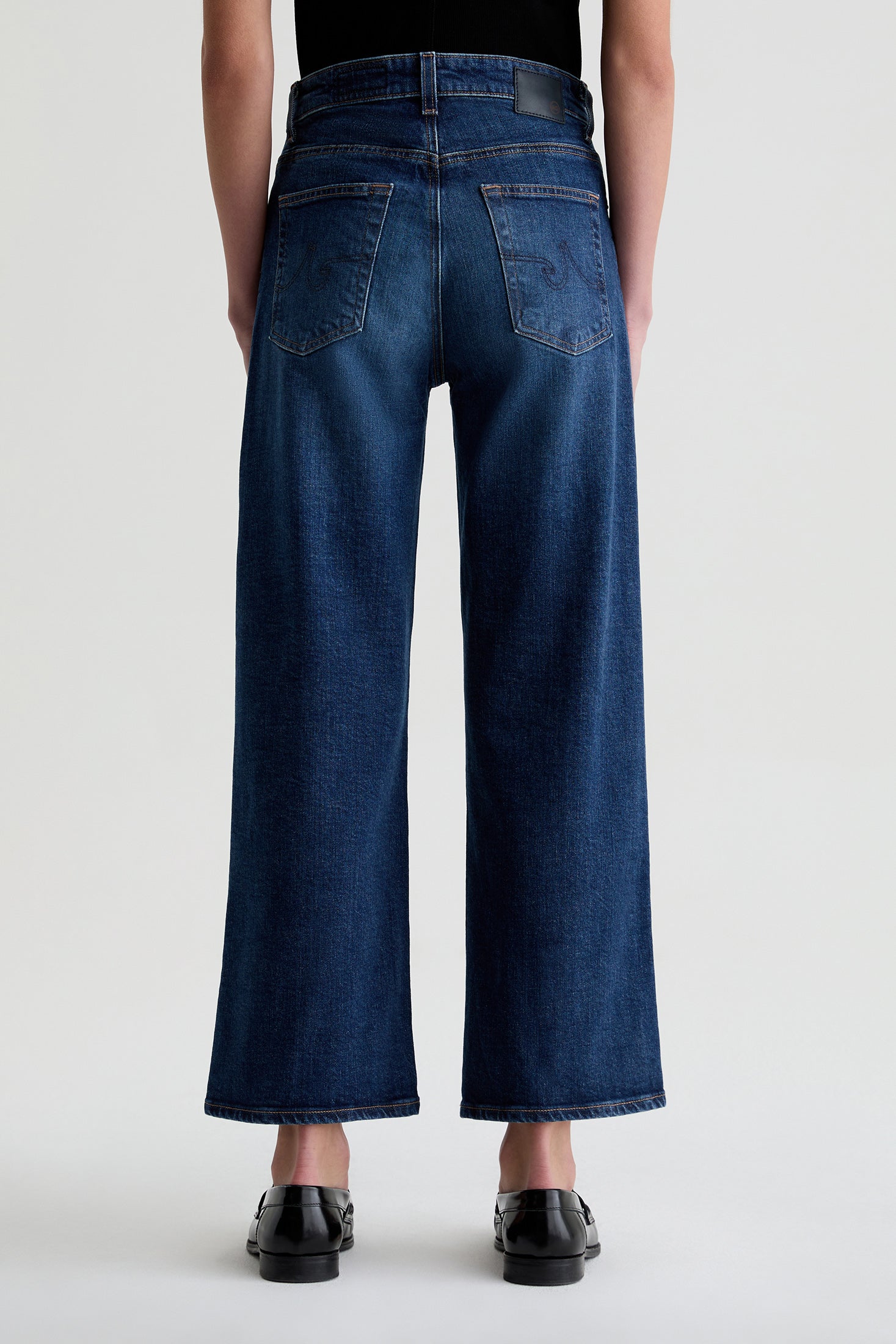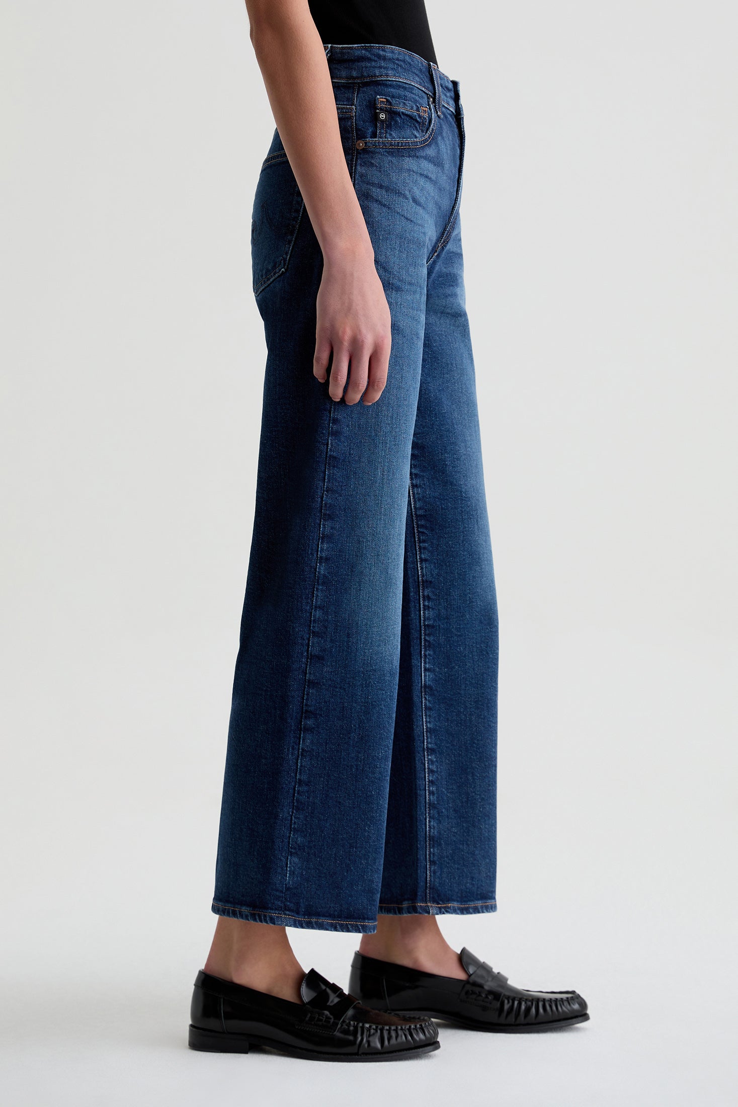 The Saige Wide Leg Crop is a mid-rise jean with loose, cropped legs and clean hems. Crafted from Vintage Comfort Stretch Denim, for superior comfort and style. Designed with classic five-pocket styling and premium construction for everyday wear. Shown here in a dark wash hue with subtle wiskering to give it a lived in look.