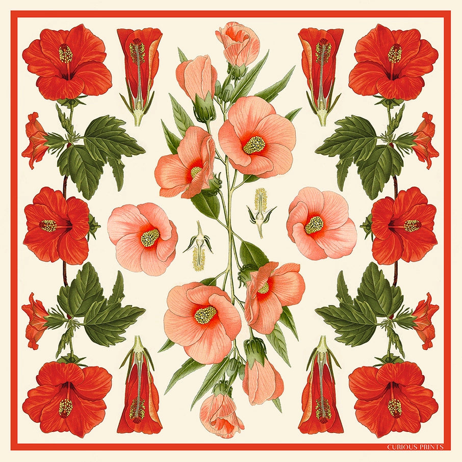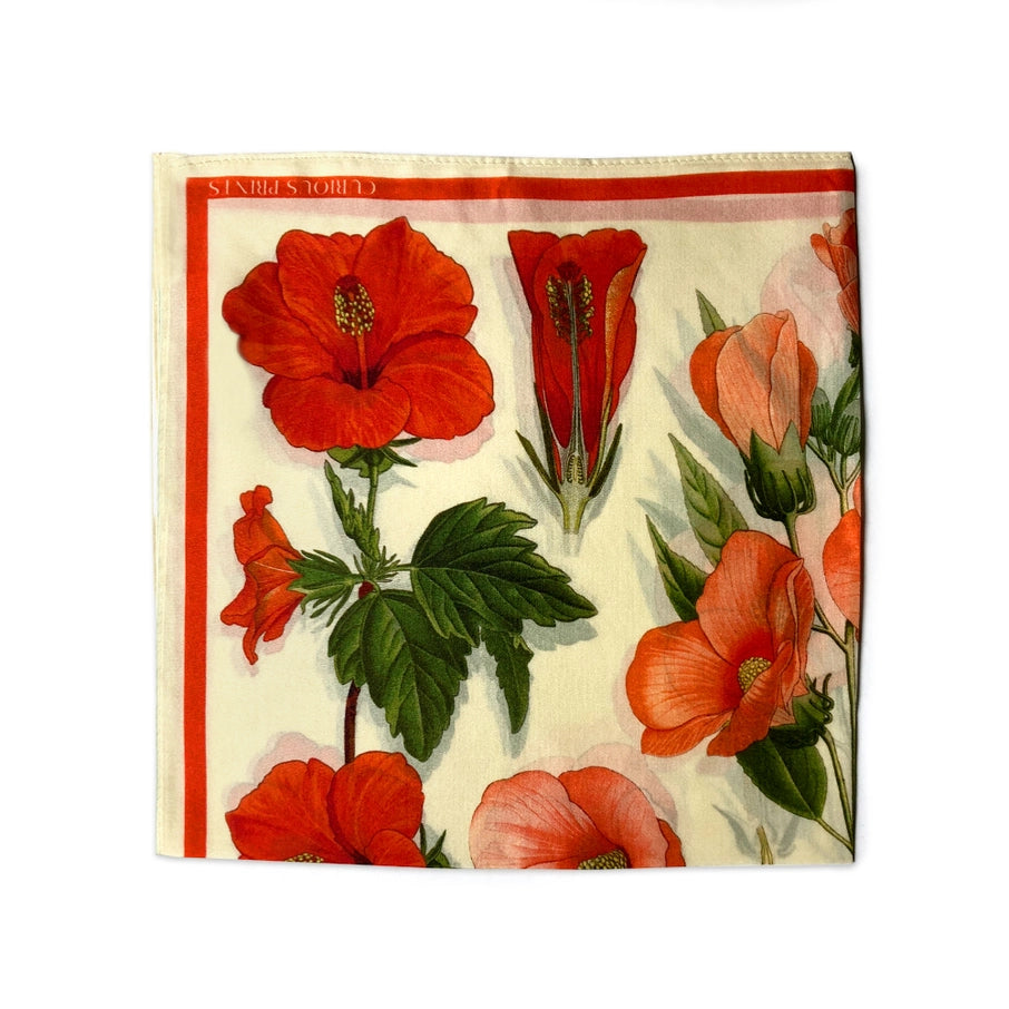 Our silk scarves are designed using vintage botanical illustrations. The custom pattern is printed on 100% silk habotai fabric and finished into a lovely square scarf by hand. These scarves are light and airy and the special print process allows the print to be seen through both sides of the scarf. The print is permanent and will never fade with use or washing.