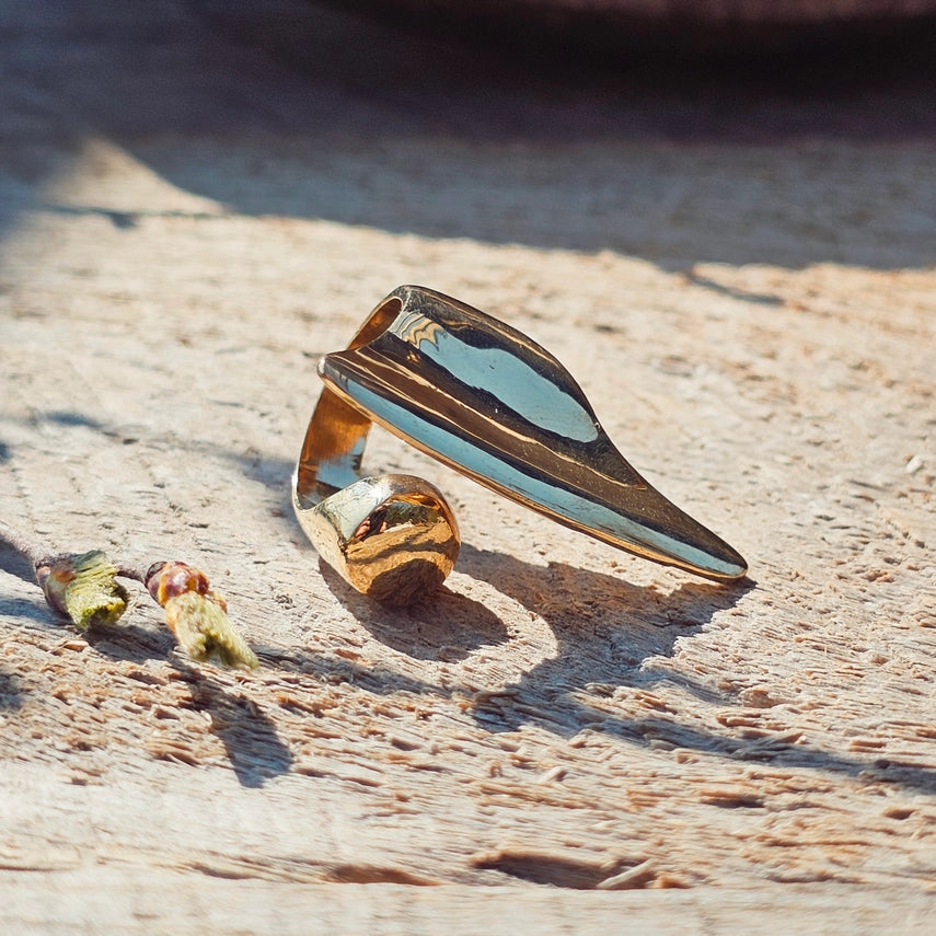 Solid brass blade and sphere open adjustable ring. These are hand cast and show natural handcrafting irregularities which renders a unique perfectly imperfect character to each piece.