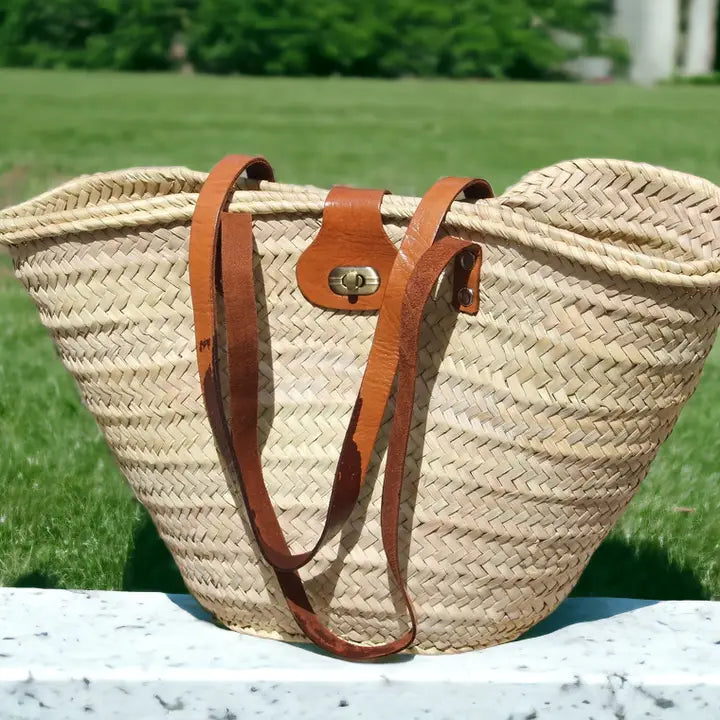 Handwoven in Morocco with sustainable palm leaves and leather handles just long enough to go over the shoulder. It also has to added advantage of a leather buckle and strap to keep everything safe inside.