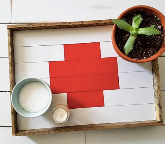 Made from reclaimed lumber and edged with found barn wood, this serving tray is sure to be a beautiful addition to any home. Each piece of wood is carefully cut and sanded, painted or stained and sealed, and assembled by hand in the workshop. Whether it is on a dresser to store jewelry and perfume, a bar cart for all your essentials, or a coffee table for books and flowers, this tray is sturdy enough to hold anything that is put on it.