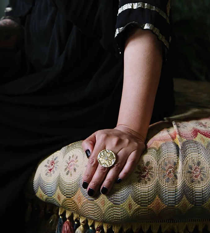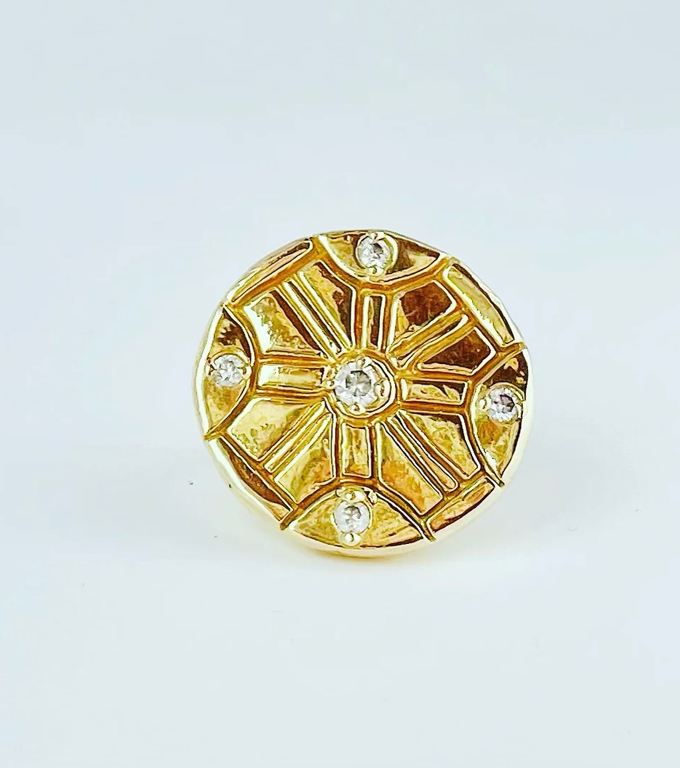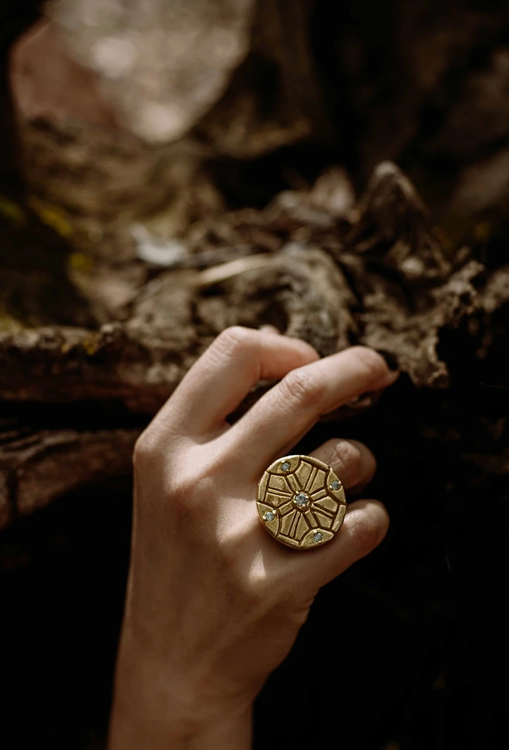 Unbroken is an ode to the struggles we go through and come out the other side of; stronger and unbroken. Unbroken is a hand carved brass ring with four 3mm white moissanites and one 4mm white or blue/ green moissanite in the center.