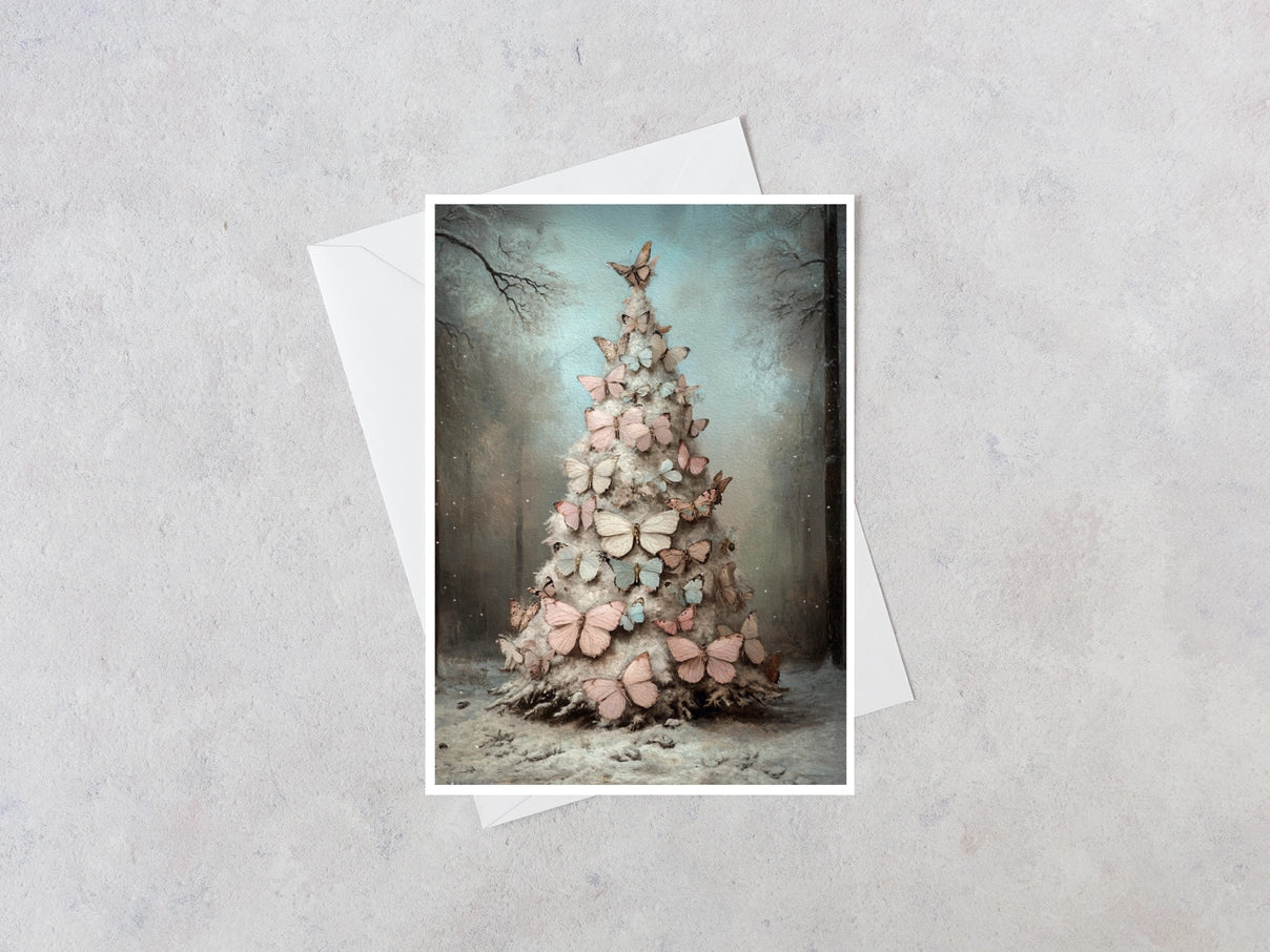 This stunning holiday card captures a magical, whimsical twist on a classic Christmas tree. Delicate butterflies in soft pastels and earthy tones have come to rest all over a snowy tree, creating a serene, enchanted scene. Set against a wintry forest background, the butterflies add an unexpected yet enchanting touch, as if nature itself is celebrating the season. This card is perfect for nature lovers or anyone looking to share a unique and ethereal holiday greeting.