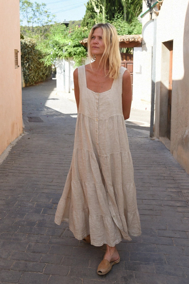 The Willow Dress is flowy, feminine, and perfect for any occasion. Easily paired with a light sweater for colder days, or worn by itself for the ideal summer dress. A maxi dress, with beautiful tiered design and mother of pearl buttons all down the front, allowing for a versatile approach to dressing, and a square neckline adds extra boho elegance. The dress has some structure while leaving plenty of room for comfort and style. Designed to be maternity and breastfeeding friendly, for a timeless approach to dressing