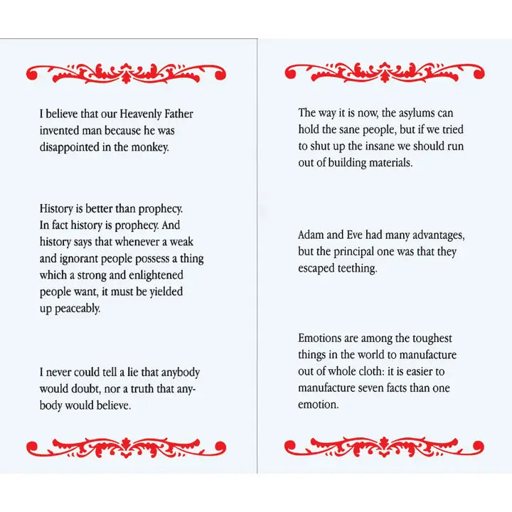 Handsome pocket-sized volume presents a range of quotations by America's foremost satirist, Samuel Clemens, known by his pen name, Mark Twain.