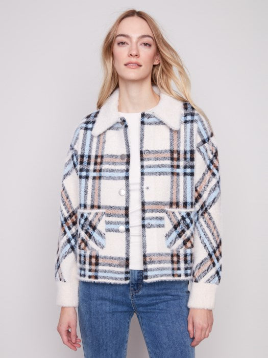 Step into cozy chic with the Eyelash Yarn Jacquard Short Jacket. This stylish jacket features a charming plaid pattern in a soft palette of cream, light blue, and warm tan. The plush white sherpa collar adds a touch of luxurious warmth and texture, beautifully framing the face. Designed with a slightly cropped length and a relaxed fit, it's both fashionable and comfortable. Functional patch pockets at the chest complete the look, making it a perfect layering piece for cooler days.
